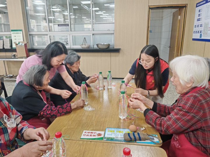 “首先打一个总结,然后一股一股地编下去......”福利院党支部部分党员联合塔山社区志愿者还组织了“编立夏蛋”的趣味活动,手把手地教大家编织,用五彩绳编织成一个个精巧的立夏蛋套,大家一边编着蛋套,一边畅谈自己小时候过立夏的趣事,传来阵阵欢笑声。